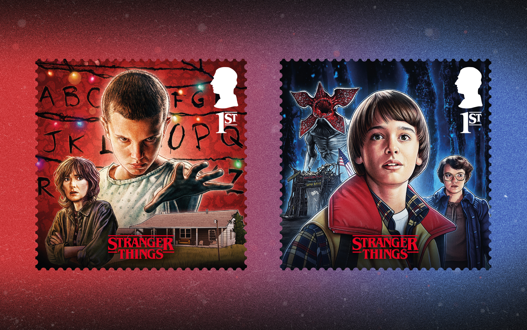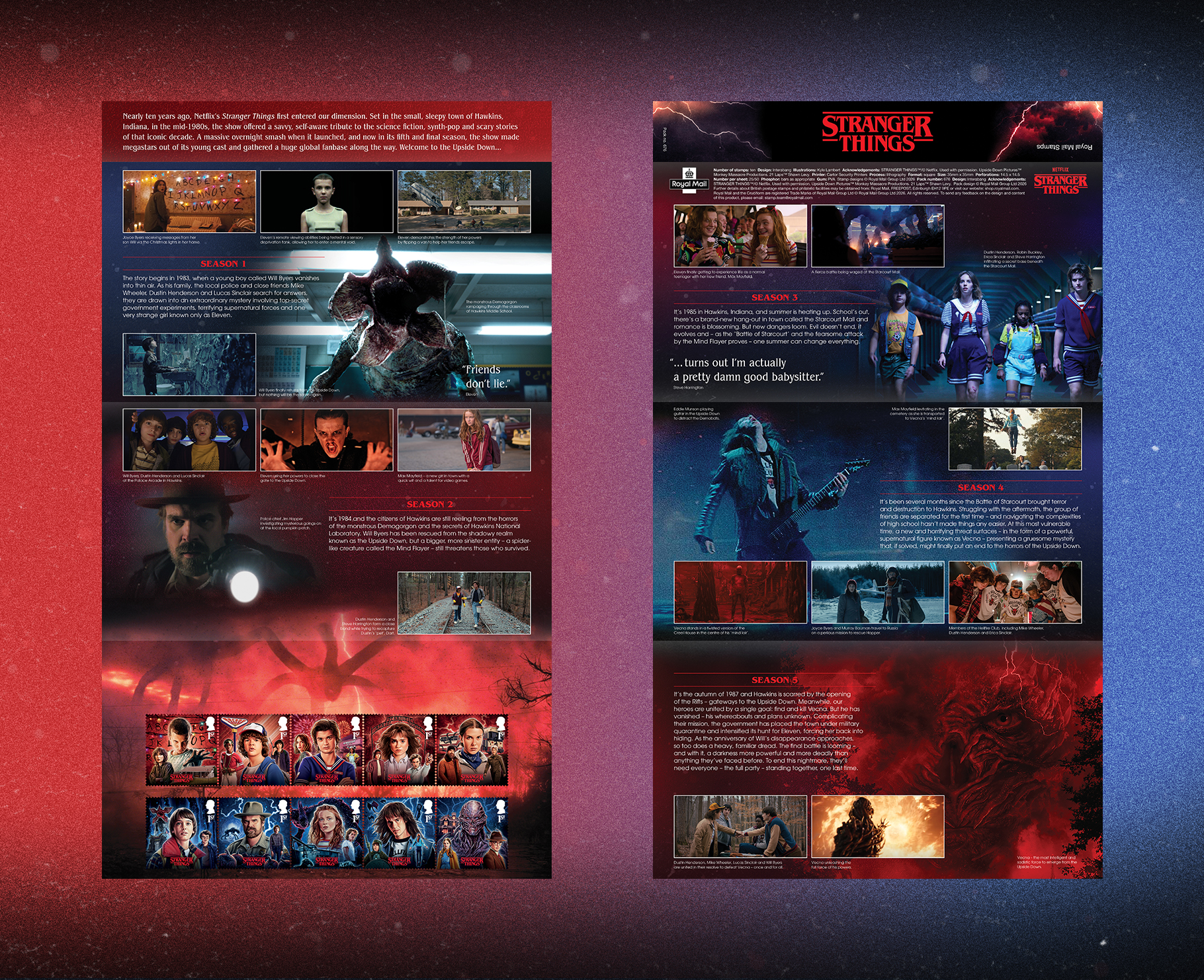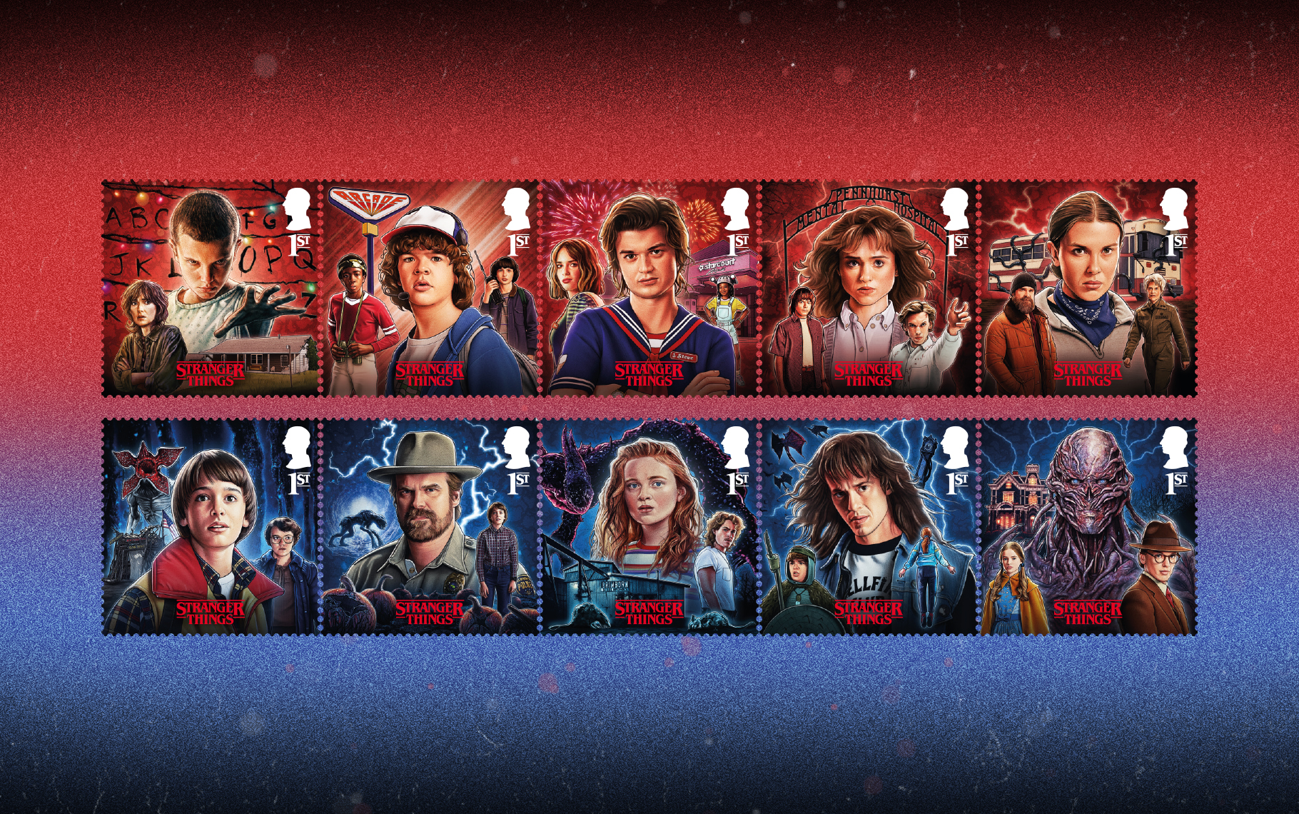 The set of stamps captures key characters and moments from all five seasons and uses a bold colour split, red for The Rightside Up and blue for The Upside Down, to distinguish the two worlds.