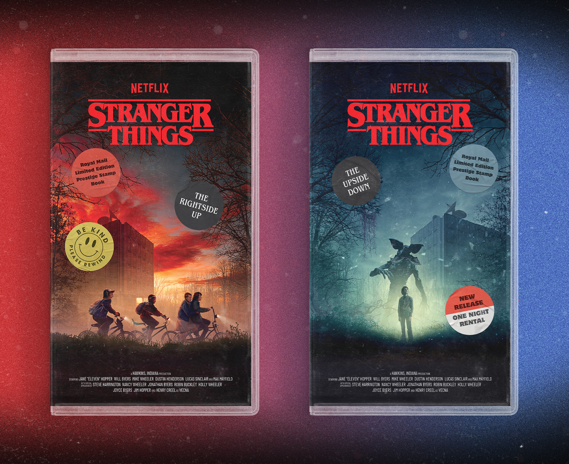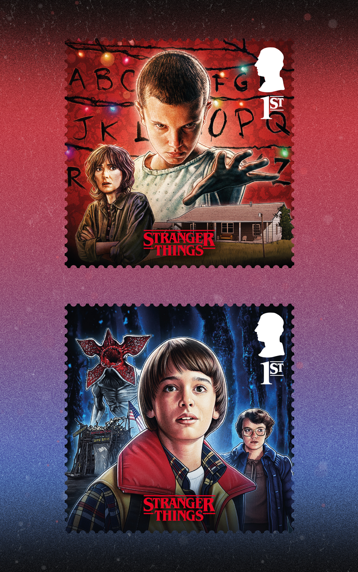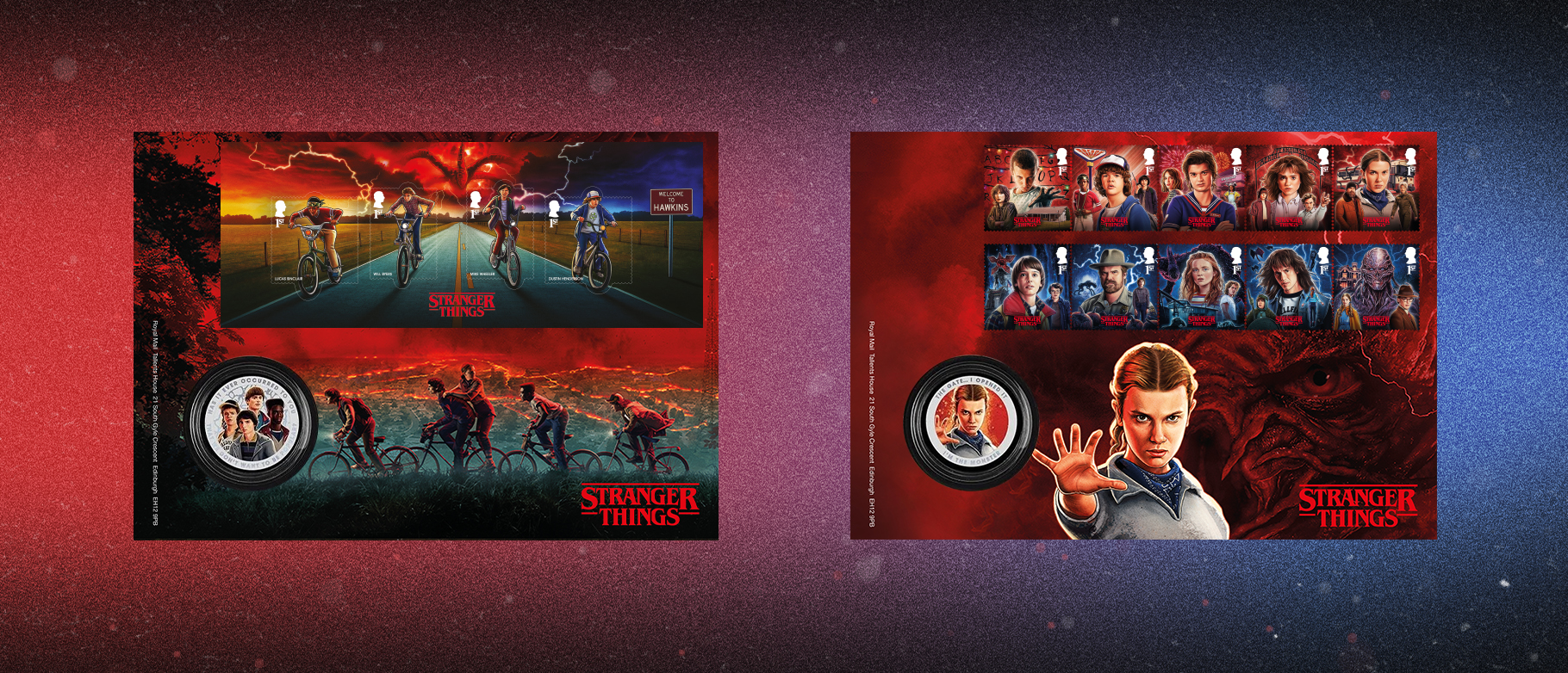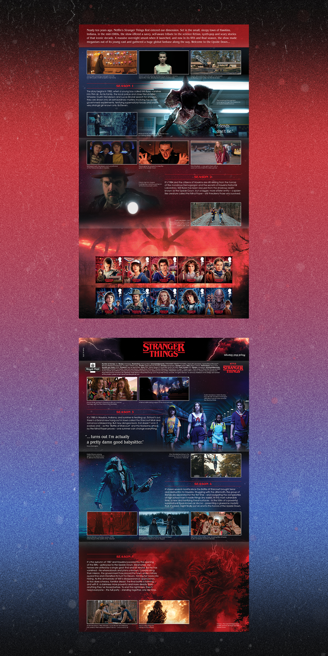 The set of stamps captures key characters and moments from all five seasons and uses a bold colour split, red for The Rightside Up and blue for The Upside Down, to distinguish the two worlds.