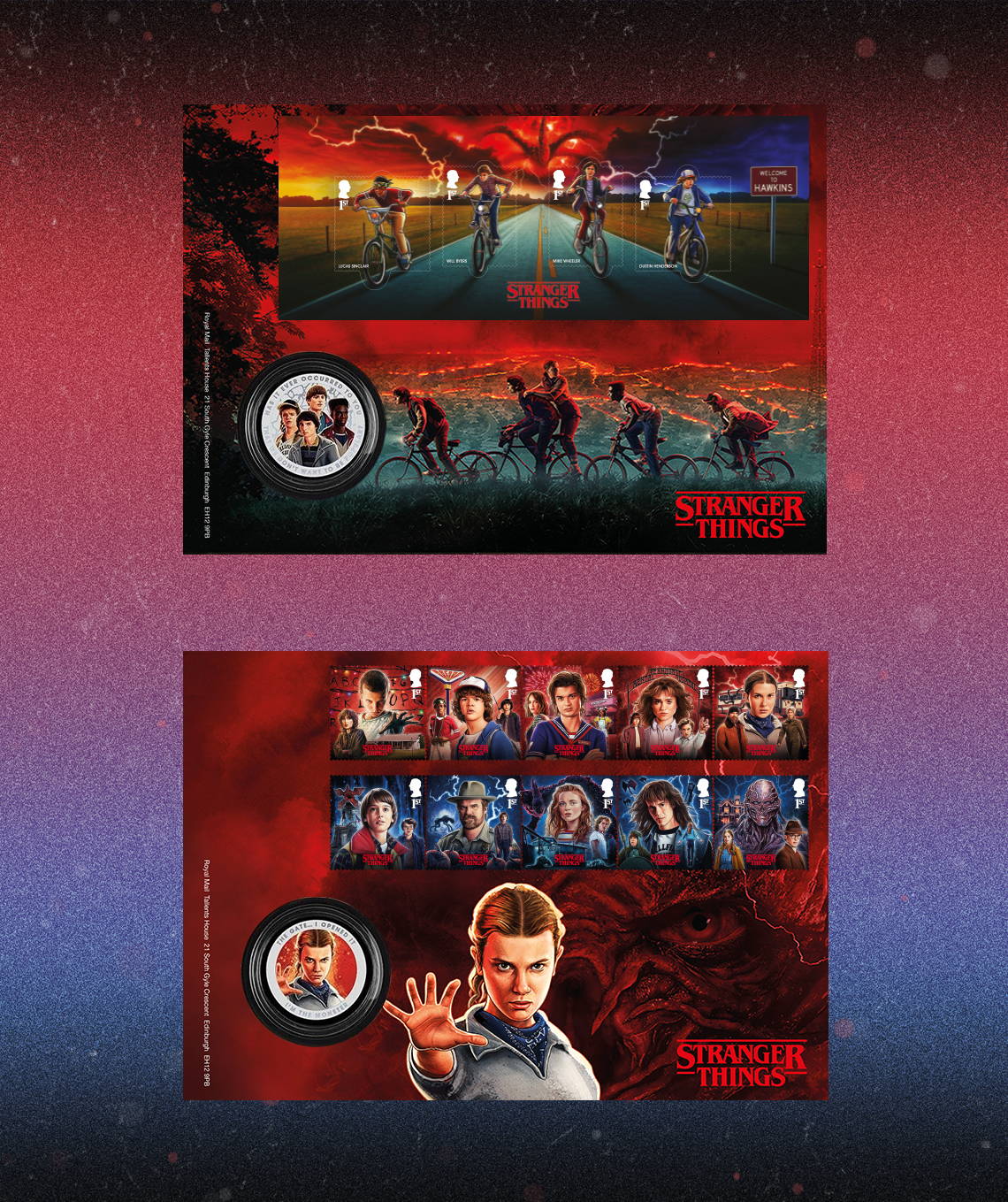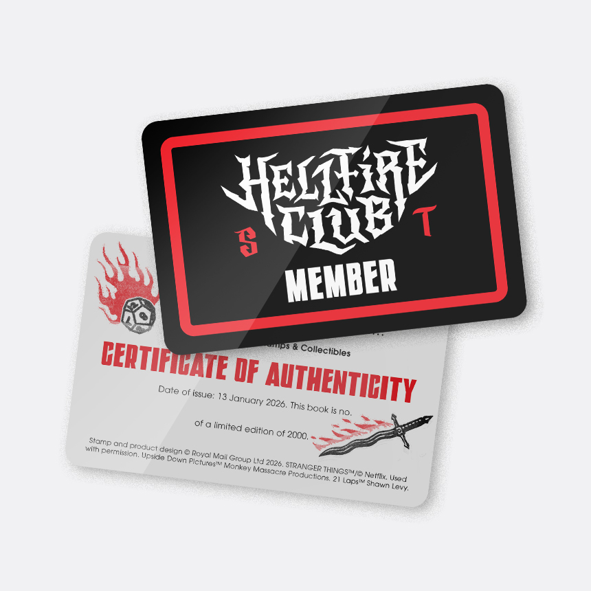 The accompanying miniature sheet depicts Lucas, Will, Mike and Dustin racing through Hawkins on their iconic 1980s bikes, silhouetted against the looming threat of the Mind Flayer. Ultraviolet-activated features, including the Hellfire Club emblem on the stamps and the boys’ bike lights on the miniature sheet, are hidden throughout the designs, adding an extra layer of discovery for fans and collectors.